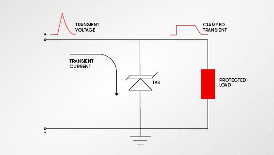 This figure shows the process by which TVS leads the transient current to the ground. It shows that the voltage observed by the protected load is limited by the clamping voltage level of the TVS.